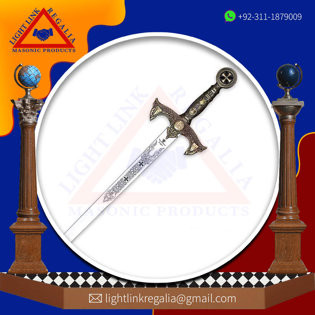 A highly decorative and traditional Masonic ceremonial sword, featuring a uniquely detailed blade and a richly colored hilt.